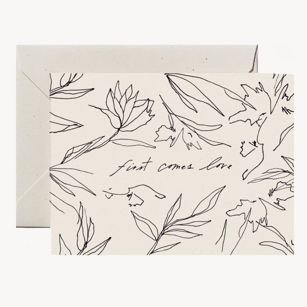 بطاقة تهنئة أنيقة بعبارة "First Comes Love" تضيف لمسة شخصية لأي رسالة أو هدية.