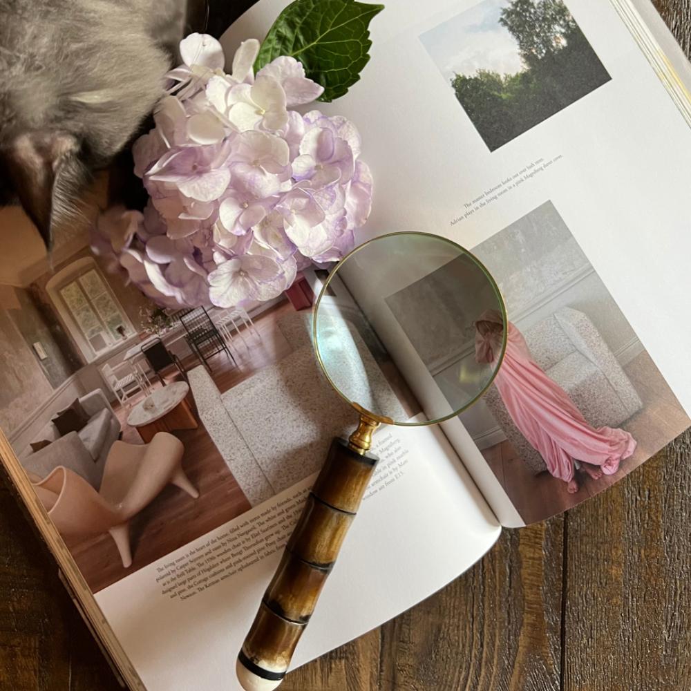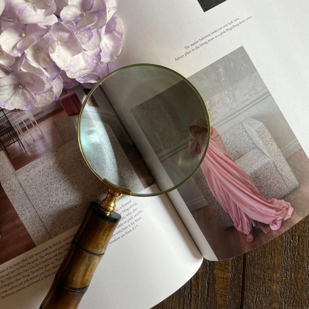 عدسة مكبرة بمقبض أنيق باللونين البني والبيج الفاتح،